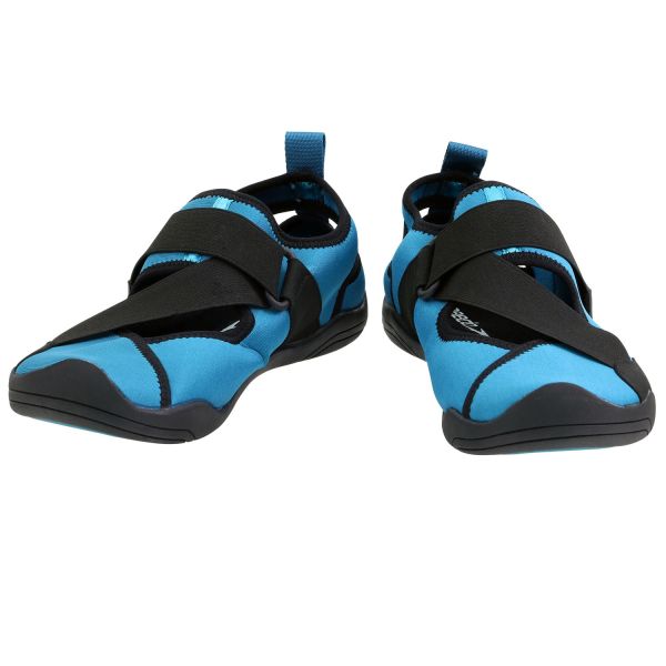 Outer rubber-soled shoes suitable for both water and land. The outsole octopus sucker system prevents slide by enhancing grip power. Mesh and water holes dress up the shoes outer soles to drain water and ensure a quick dry and ventilation when on land. Crafted in a melange of Spandex and polyester fabric, the shoes are light weight and provide a barefoot feel! A midfoot velcro strap provides a great fit, and ensures better safety.