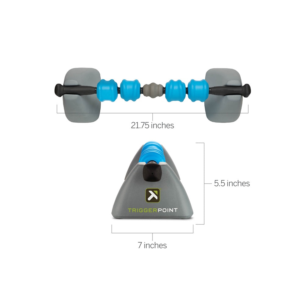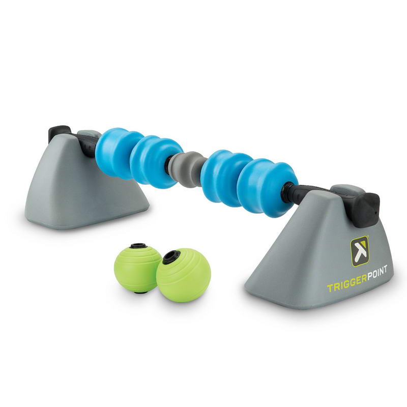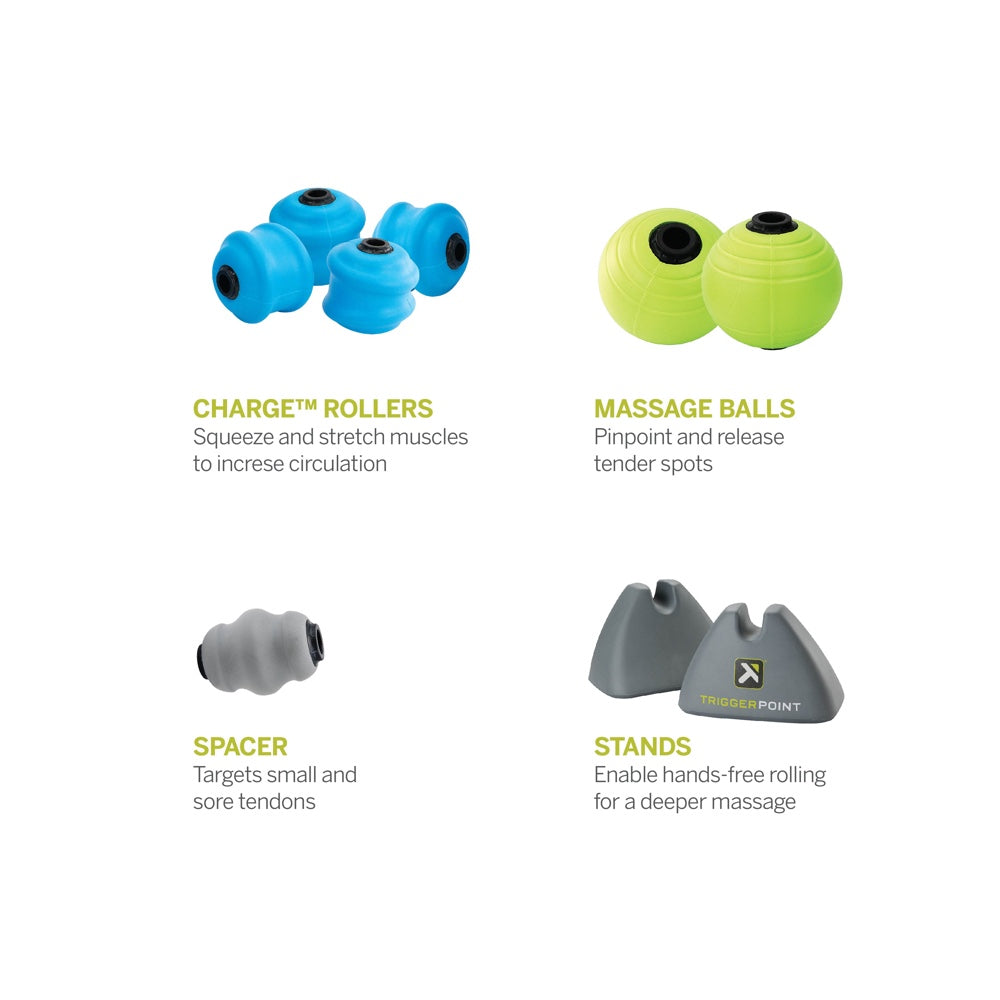 ● CHARGE rollers squeeze and stretch muscles, increasing circulation. Massage balls pinpoint and release tender spots. Spacer targets small and sore tendons.
