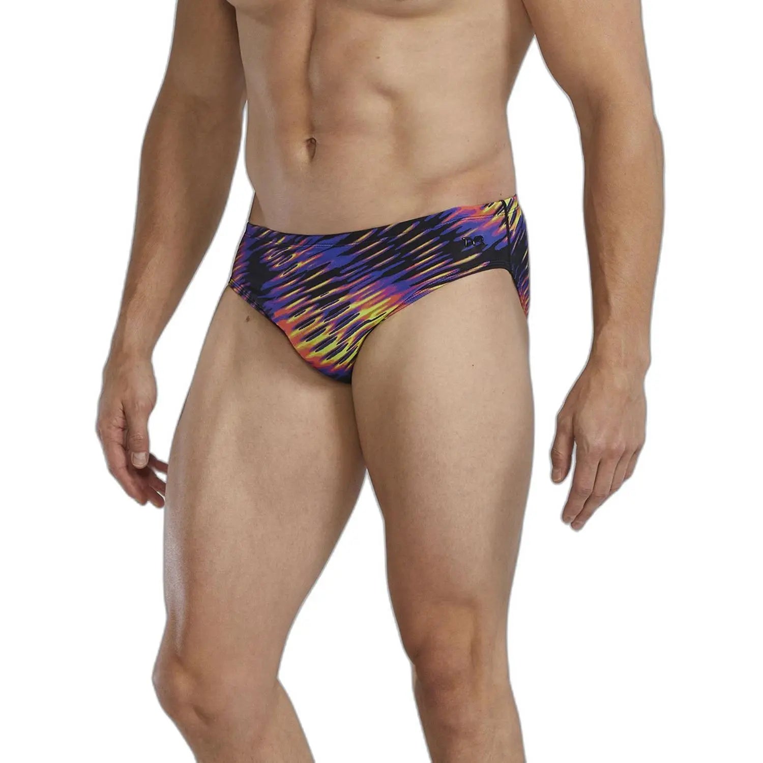 TYR Men's Swim Briefs, made with TYR's most durable textile, Durafast Elite®, featuring high-denier polyester and an innovative circular knit construction that combines the strength and color fastness of polyester with the comfort of spandex. The TYR Men's Midfoot Swim Briefs are designed to stop just above the knee and feature a compression fit and an adjustable drawstring waist. Champion cuts and bold prints enhance the suit's high-tech look. The trunks allow unrestricted mobility and are ideal for athletes who want complete protection and coverage every time they swim.