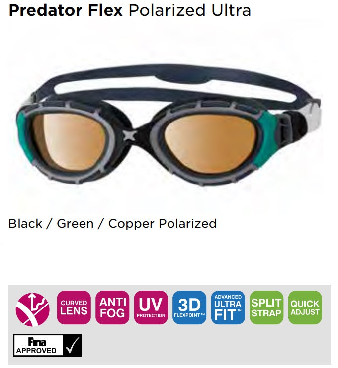 Zoggs Predator Flex Polarized Swimming Goggles feature new Ultra-Fit frame technology for an "invisible fit" feel and a new streamlined fluid-dynamic profile. The superb comfort of Predator Flex remains with unique 3D Flexpoint Technology™ for enhanced frame flexibility. The perfect outdoor swimming partner, these goggles feature copper Polarized lenses, ideal for high level light, reducing glare and reflections of the sun. The lenses also offer Fogbuster™ anti-fog for exceptional clarity, UV protection and CLT™ Curved Lens Technology for 180° peripheral vision. It is a must-have for looking great while achieving optimum performance in those open water swims.
