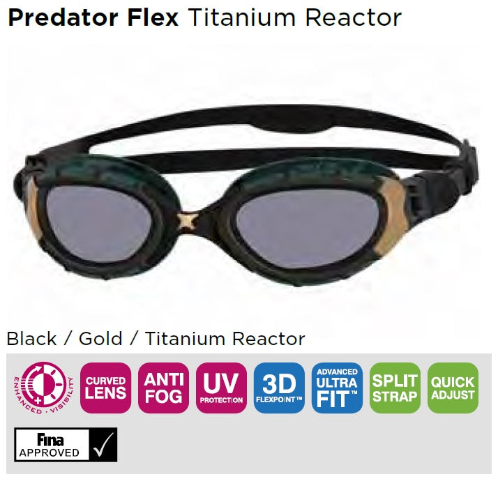 Reactor Titanium Lens : Photochromatic lenses which react to the sun, so darker lenses in brighter conditionsPolarized filter to cut glare and reflected lightProvides automatic UV protection and glare controlReduces painful and discomforting glareReduced eye fatigueAutomatically adjusts to the changing light conditions outdoors by turning darker to reduce glareFast to activateUV Protection : Maximum UV protection blocks 100% of the sun damaging UVA and UVBCurve Lens Technology : 180o Peripheral VisionFogbuster™ lenses : Fog-free swimmingQuick Adjust Strap: Fast and secure, the easiest way to get just the right fit