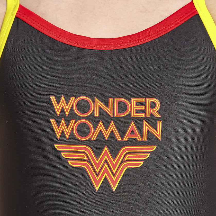 They can dive into the fun lane with their favourite superhero with the Zoggs Wonder Woman Strikeback Swimsuit. Featuring medium width straps that draw into the centre of the back for optimum performance, and enhanced freedom of movement. The open back allows for greater flexibility while the high scoop neckline provides modesty. This swimsuit is made from quick drying, chlorine resistant fabric and is an absolute must-have for young Wonder Woman fans.