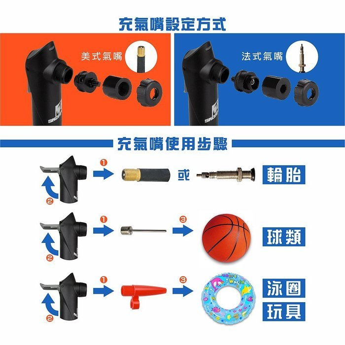 ● 可逆幫浦頭適用於 Presta 和 Schrader 閥門